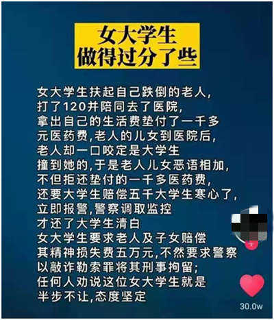 某平臺曾經(jīng)有這么一個(gè)短視頻,引起幾十萬的點(diǎn)贊。一個(gè)女大學(xué)生扶起一位自己跌倒的老人,并打120陪同老人去了醫(yī)院,還先期墊付了1000多的藥費(fèi);結(jié)果是什么?老人的兒女到了醫(yī)院后,被扶的老人卻一口咬定撞倒他的是女生,所以老人子女不僅沒有感謝女學(xué)生,反而惡語相向,拒不返還前期墊付的藥費(fèi),還要向女生索賠5000元。