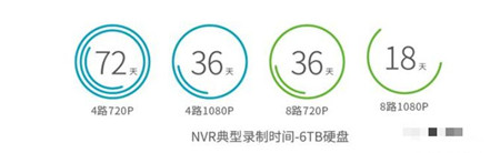 4.分辨率:對(duì)于監(jiān)控?cái)z像頭來(lái)說(shuō),清晰度很關(guān)鍵。攝像機(jī)的分辨率越大、傳感器像素越高,拍出來(lái)的圖像就越清晰。但它所占用的帶寬和內(nèi)存空間也會(huì)更大,同樣大小的硬盤所能錄下的時(shí)間也就越短。以一臺(tái)6T的NVR為例: